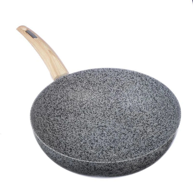 Сотейник диаметром 28 см из литого алюминия, с антипригарным покрытием с расцветкой "под мрамор", с бакелитовой ручкой с покрытием "софт-тач" и однослойным дном - подходит для всех типов плит, кроме индукции.