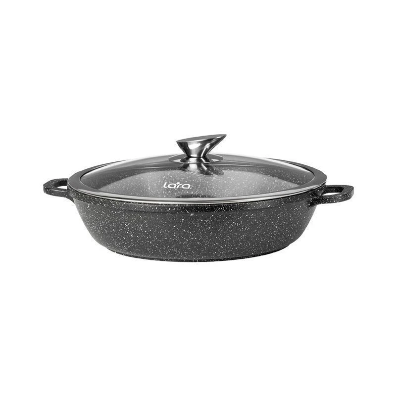 Сотейник выполнен из литого алюминия с отличными теплопроводными свойствами. Прочное двухслойное антипригарное покрытие с минеральными частицами надежно защищает дно и стенки от повреждений. Крышка с паровыпуском изготовлена из жаропрочного стекла, имеет защитное кольцо и удобную стальную ручку G-формы. Капсулированное дно подходит для всех типов поверхностей.