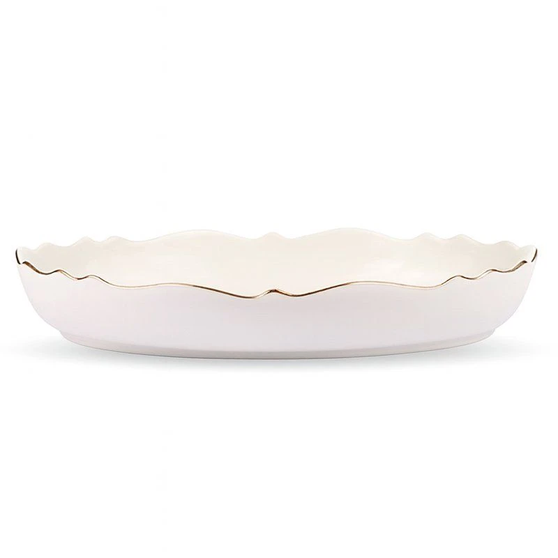 Блюдо сервировочное LORAINE – это стильное решение для любого торжества. Этот элемент декора создаст атмосферу роскоши на вашем празднике. Посуда для сервировки изготовлена из керамики высокого качества. Окантовка золотого цвета придает изделию особый шик и элегантность, подчеркивая его премиальность. Благодаря своим размерам блюдо для подачи подойдет для легких закусок, фруктов, овощей, свежей выпечки, десертов, печенья, сыров, салатов, и даже для таких блюд как шашлык, плов, картофель, блюда из рыбы и мяса – эта посуда сервировочная справится со всеми кулинарными задачами. Блюдо овальное LORAINE сочетает в себе функциональность и эстетику. Возможность мытья в посудомоечной машине делает уход за ним максимально простым и удобным. Практичность и удобство использования делают эту посуду для сервировки незаменимым помощником на кухне. Такое декоративное блюдо обязательно понравится тем, кто ценит практичность и красоту в одном предмете. Это блюдо сервировочное белое может стать замечательным подарком для истинных ценителей эстетики и оформления стола. Оно подарит радость от каждой трапезы и будет радовать глаз своей изысканностью.