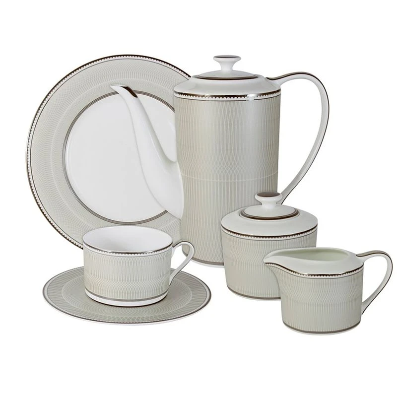 6 чашек 250мл, 6 блюдец 15см, 6 тарелок 21,5см, чайник 1,4л, сахарница 350мл, молочник 250мл