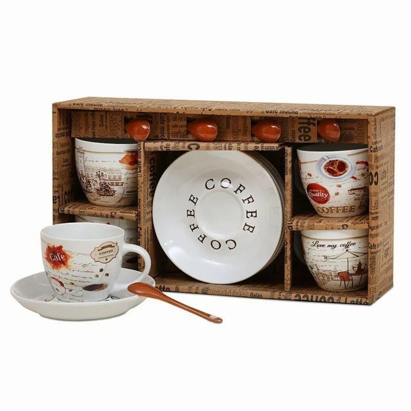 В набор входит: 4 кружки 180мл, 4 блюдца, 4 ложки
