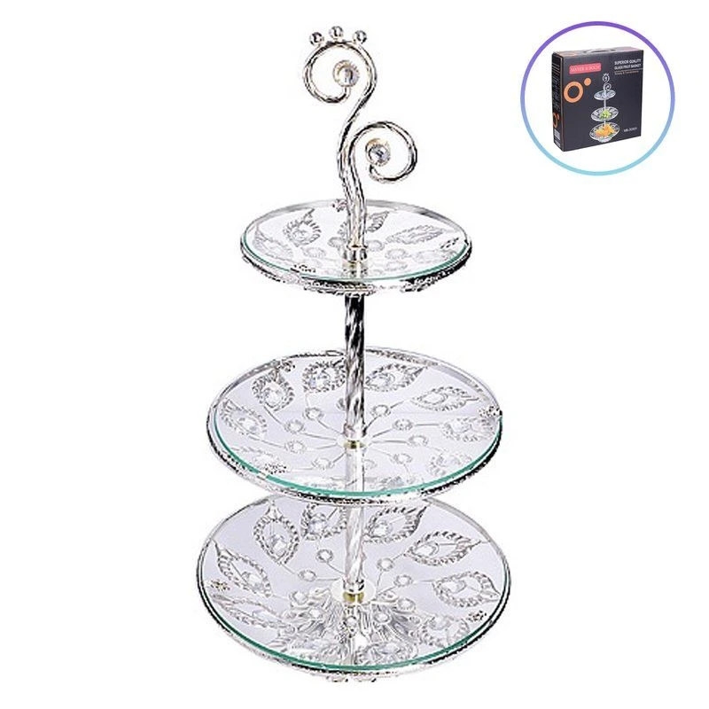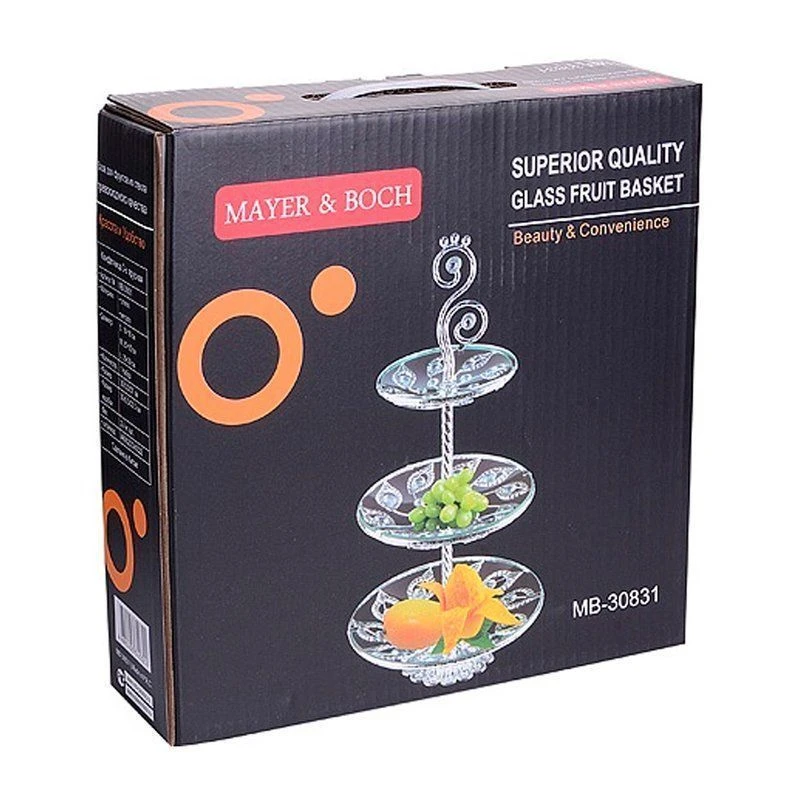 Элегантная этажерка на ножке с тремя ярусами MAYER&BOCH станет настоящим украшением любого стола, поможет хозяйке красиво подать конфеты, фрукты, орехи, выпечку, овощи и даже закуски из мясных и сырных деликатесов. Блюдо на ножке выполнено из высококачественного, ударопрочного стекла с изысканным, декоративным орнаментом. Стойка-держатель выполнена из металла с серебряным покрытием. Ярусы конфетницы оформлены оригинальными серебряными веточками из цветов. Благодаря своей трехъярусной конструкции, этажерка на стол позволит вам разместить большое количество сладостей. Ножка фруктовницы обеспечивает ей высокую устойчивость, что делает ее безопасной для использования даже на самых неровных поверхностях. Вы можете быть уверены, что ваша ваза для фруктов будет стоять надежно, не опасаясь, что она может перевернуться или сломаться. Этажерка трехъярусная прекрасно подойдёт под любой интерьер и будет сочетаться с сервировочной посудой, а компактные размеры позволят разместить ее даже на небольшом праздничном столе. Эта красивая посуда для дома украсит сервировку вашего стола и подчеркнет прекрасный вкус хозяина, а также станет отличным подарком.