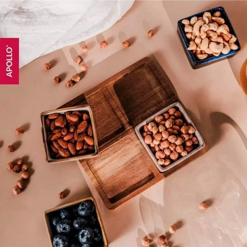 Менажница выполнена в компактном размере 19х19х1.5 см и включает в себя 4 секции, которые позволяют удобно разместить различные закуски и соусы. Это делает её незаменимой для сервировки разнообразных блюд, от свежих овощей до изысканных деликатесов. Деревянная подставка добавляет изделию особый шарм и прочность, обеспечивая устойчивость и удобство в использовании.