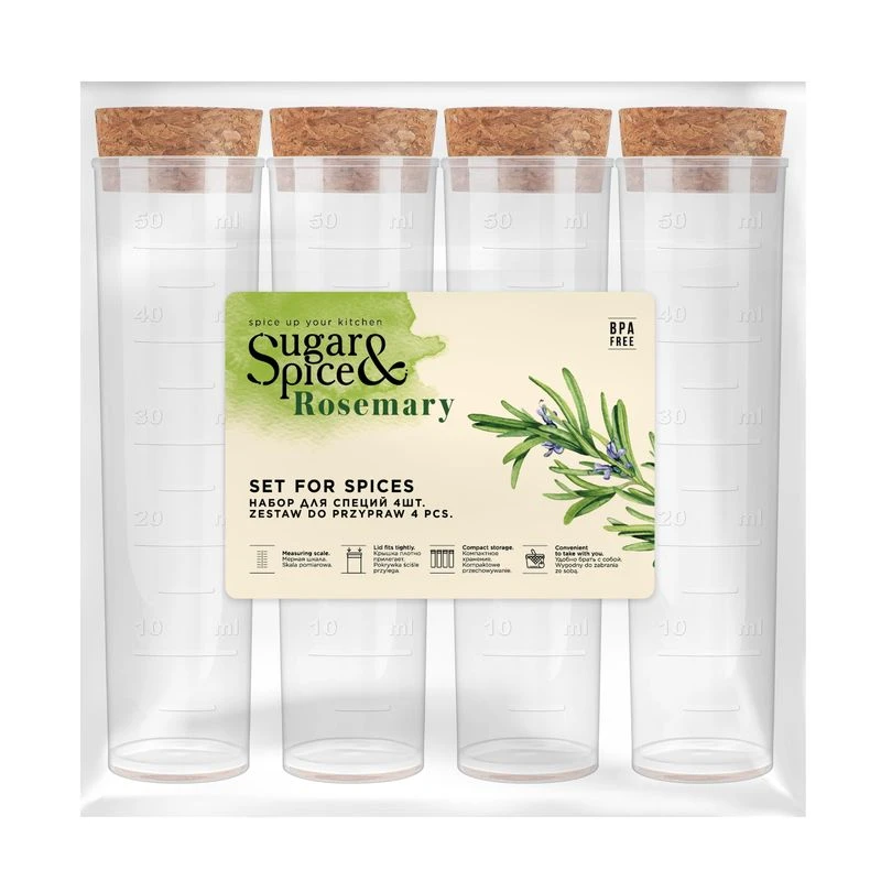Компактный набор емкостей для хранения специй Sugar&Spice Rosemary состоит из 4-х прозрачных емкостей объемом 50мл. Крышка из натуральной пробки плотно закрывается, тем самым специи не впитывают влагу, а аромат и вкус специй сохраняется надолго. Прозрачный корпус помогает различать специи, а также можно видеть какое количество специй в контейнере, и пополнять запасы, когда это необходим. Набор емкостей станет украшением интерьера кухни на открытых полках.