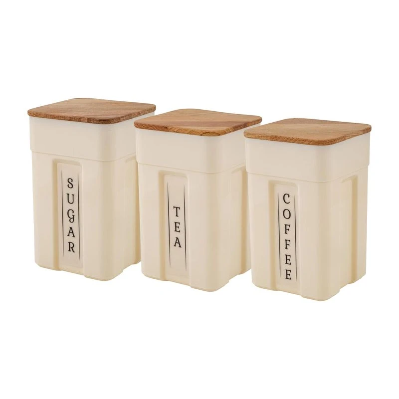 Набор банок для сыпучих продуктов с деревянной крышкой состоит из 3-х прочных емкостей объемом 750 мл каждая и надписями "sugar" (сахар), "tea" (чай), "coffee" (кофе). Крышка из натурального бука плотно закрывается, тем самым содержимое не впитывает влагу, а его аромат и вкус сохраняются надолго. Надписи на корпусе позволяют быстро найти нужный продукт без открытия каждой банки. Для сохранения качества бука: не рекомендуется мыть в посудомоечной машине, нельзя греть в микроволновой печи и замачивать на длительное время в воде. Необходимо мыть тёплой водой с мыльным раствором, после мытья тщательно просушить. Каждые 2-3 месяца деревянные крышки необходимо покрывать пищевым маслом. Размер одной банки: 8,7х8,7х14см. Температурный режим: от -5°C до +70°C.