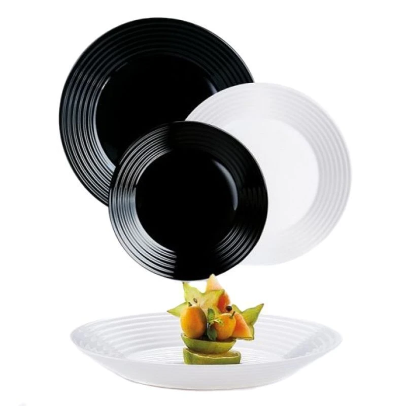 Столовый набор серии Арена Блэк-Уайт выполнен из ударопрочного стекла, устойчивого к резким перепадам температуры. Возможно использование в посудомоечной машине и СВЧ.