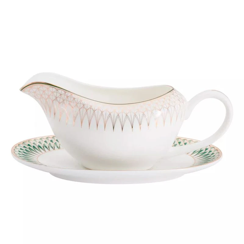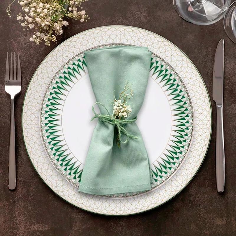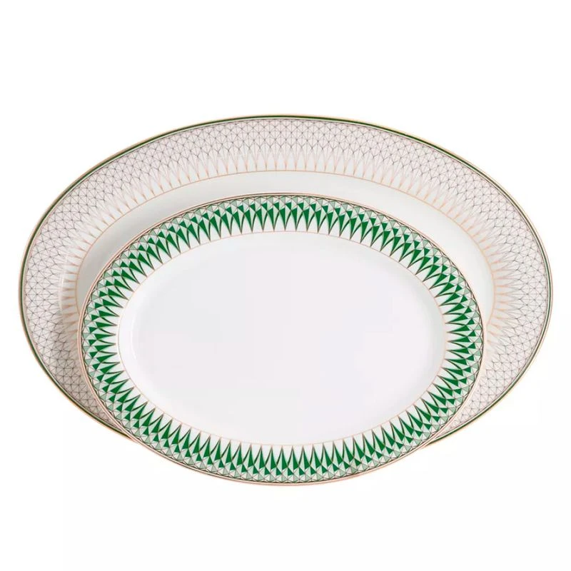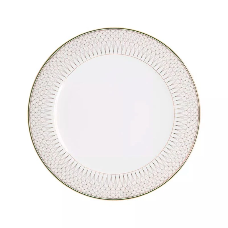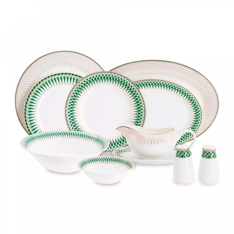 6 обеденных тарелок 27см, 6 суповых тарелок 21см, 300мл, 6 закусочных тарелок 21см, салатник 23см, 1,75л, 2 салатника 16см, 750мл, 1 блюдо 36см, 1 блюдо 26см, соусник, блюдо под соусник, солонка, перечница