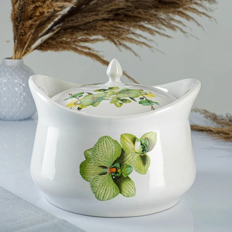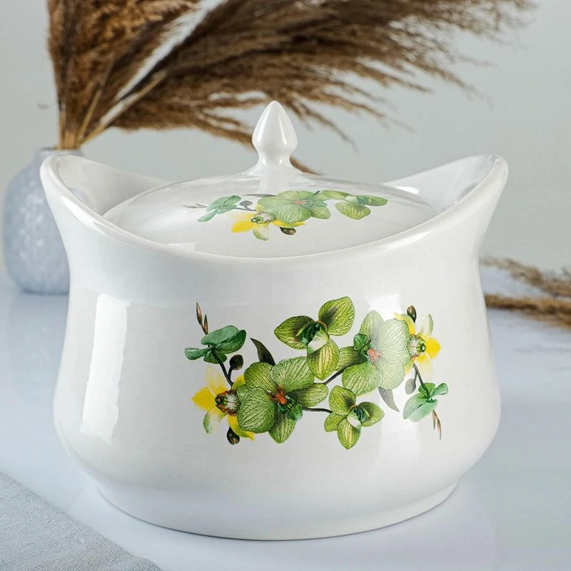 Супник изготовлен из высококачественного фарфора, которое делает посуду устойчивой к механическим повреждениям. Фарфоровая посуда сохраняет температуру содержимого в течение продолжительного времени. Супница переносная имеет плотную крышку, которая помогает защитить бульон от внешнего воздействия.