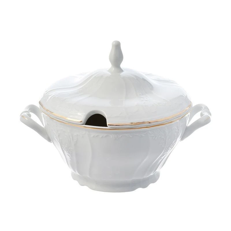Супница - 1 шт. Супница 2500 мл, "Bernadotte", декор "Отводка золото" . Супница - идеальное дополнение к вашей кухне и столовой! Этот изысканный предмет посуды не только придаст элегантность вашему столу, но и обеспечит комфорт при сервировке и подаче супов и холодцов. Благодаря своей ёмкой форме, она вмещает достаточное количество супа или бульона. Наша супница станет стильным акцентом в любом интерьере и привлечет внимание гостей. Ее глубокие стенки позволяют сохранять тепло блюда, так что вы всегда сможете наслаждаться горячим супом или холодцом. Будьте уверены, что наша супница идеально подойдет для сервировки стола. Она легко сочетается с другой посудой, такой как тарелки, чашки и ложки, создавая гармоничный образ кухонной сервировки. Спешите приобрести нашу супницу и добавить неповторимости вашему столу! Она прекрасно впишется в любую кухню и станет незаменимым предметом для сервировки ваших самых вкусных супов и бульонов. Раскройте новые возможности кухонной посуды с нашей супницей!