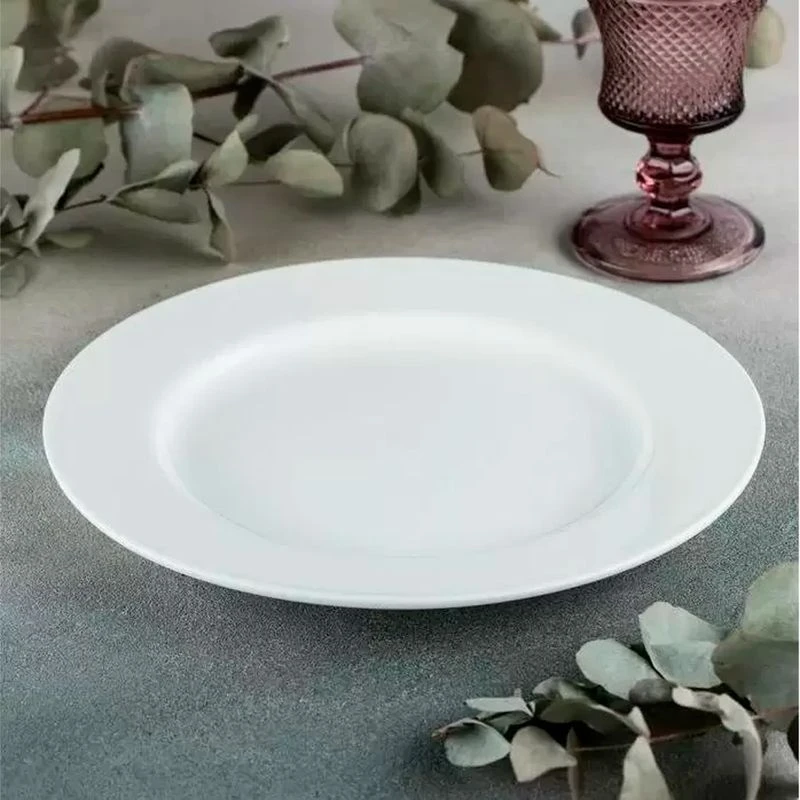 Большая круглая обеденная тарелка с бортами имеет достаточно большой объем для того, чтобы вместить в себя большую порцию салата или второго блюда. Плоская тарелка для горячего, десертов, закусок и салатов имеет стильный современный дизайн, благодаря чему она прекрасно впишется в любой интерьер и станет украшением обеденного стола. Тарелка выполнена из тонкого белого фарфора и покрыта глазурью для придания ей прочности и продления срока ее службы. Благодаря глазури фарфор не впитывает соки от еды и легко моется вручную, а также обладает устойчивостью к царапинам и трещинам даже при неосторожном использовании. Помыть тарелку можно также в посудомоечной машине. Термостойкая плоская тарелка для горячих блюд также устойчива к повышению температуры, поэтому еду в ней можно подогреть в микроволновке или свч-печи.