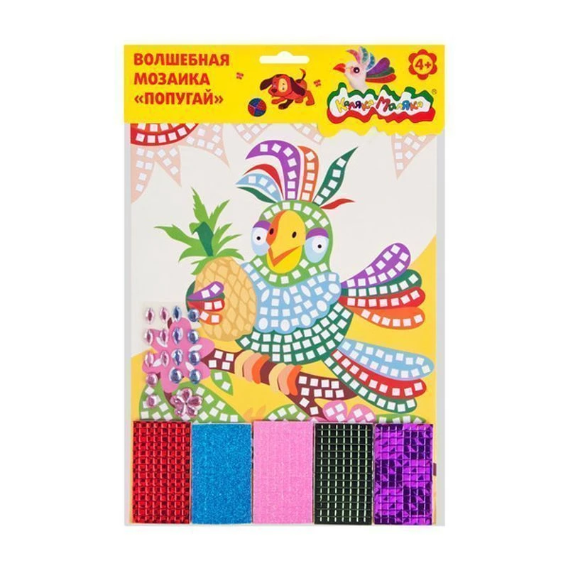 Детали мозаики выполнены из мягкого полимерного материала EVA, экологичны и абсолютно безопасны для ребёнка. Разноцветные самоклеящиеся стразы выполнены из безопасного мягкого пластика.