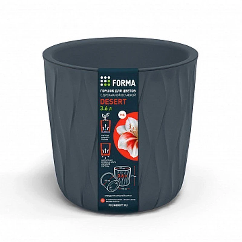 Горшок для цветов с дренажной вставкой Desert 3,6л изготовлен из высококлассного полимерного сырья, которое не содержит бисфенол-А, фталаты и другие вредные вещества. Материал отличается прочностью и легкостью, не имеет посторонних запахов. Ножки дренажной вставки образуют пространство, препятствующее скоплению воды и загниванию корней. Гладкие внутренние стенки препятствуют врастанию корней и легко моются. Новый уникальный дизайн горшка Desert будет акцентным элементом в интерьере, напоминая о природных мотивах. Современный глубокий серый цвет дополнит интерьер нотками строгости и изысканности.
