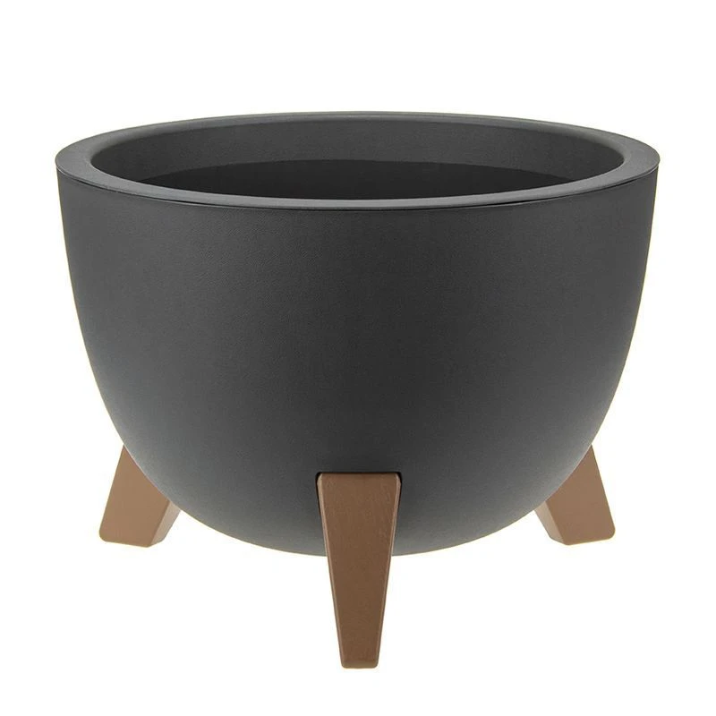 Кашпо со вставкой на ножках имеет круглую форму и матовую поверхность.