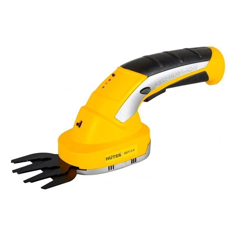 Триммер-кусторез Huter GET-3,6 — универсальный садовый инструмент, позволяющий без излишних усилий подстригать разросшиеся кусты и газонную траву на даче или приусадебном участке. В комплект прибора входит литий-ионный аккумулятор и два ножа (для кустов и травы). Аккумулятор дает возможность заниматься работами в любой точке сада без подзарядки. Каждый из ножей имеет по два лезвия, двигающиеся друг относительно друга. Нож для подрезки кустов двусторонний и позволяет подстригать маятниковыми движениями ветки растений толщиной до 8 мм. Нож для травы рассчитан на прямолинейные движения вдоль газона.