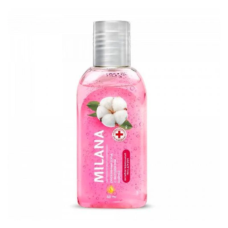 Антибактериальный гель для ухода за кожей рук Milana "Роскошный уход” с экстрактом хлопка. Основной компонент – изопропиловый спирт. Убивает 99,99% наиболее распространенных болезнетворных бактерий, грибов и вирусов. Делает кожу рук мягкой, увлажняет, оставляет ощущение свежести. Не оказывает раздражающего действия.