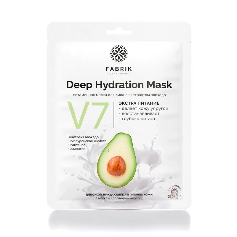 Тканевая маска с экстрактом авокадо содержит витамины Е, К, РР, группы B, которые питают и успокаивают кожу, делают её сияющей, упругой и эластичной. Пантенол увлажняет, восстанавливает поврежденные клетки, уменьшает покраснение и раздражение кожи.