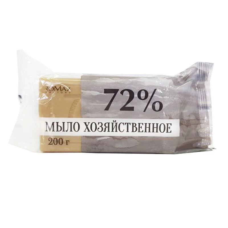 Фабрика Ромакс представляет хозяйственное мыло 72% в упаковке флоупак весом 200 грамм. Это натуральное и эффективное средство для стирки, которое подходит для всех типов тканей, включая белые, светлые, цветные, черные и темные.