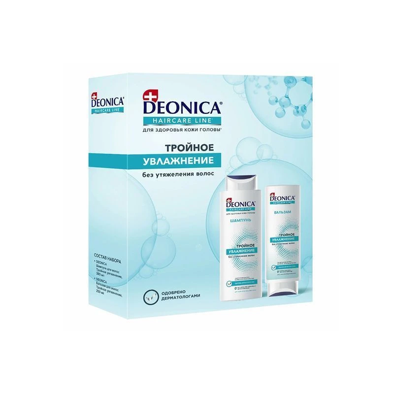 Набор подарочный женский DEONICA Тройное увлажнение Шампунь+Бальзам для волос. Шампунь изготовлен специально для тех, чьи волосы нуждаются в дополнительном увлажнении и уходе. Как правило, это обладательницы сухих, вьющихся или кудрявых волос. Три увлажнителя в составе – это защита волос от обезвоживания, непревзойденная гладкость и красота. При регулярном применении волосы заметно более крепкие и гладкие. Шампунь не просто делает волосы более яркими и увлажненными, но и не утяжеляет их. Волосы выглядят более здоровыми, локон формируется более правильно и не пушится. Бальзам изготовлен специально для тех, чьи волосы нуждаются в дополнительном увлажнении и уходе. Делает волосы легкими, послушными, облегчает расчесывание.