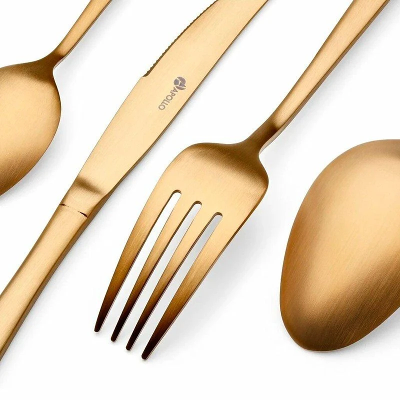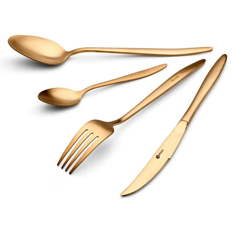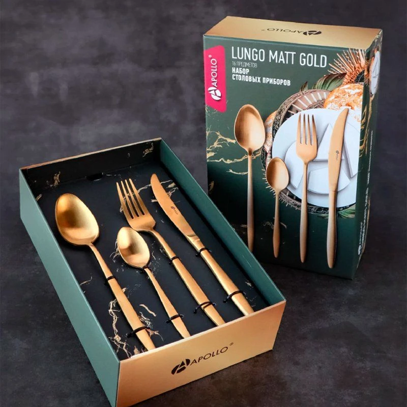 Набор столовых приборов APOLLO Lungo Matt Gold 16 предметов, на 4 персоны предназначен для сервировки стола. Приборы подойдут для ежедневного использования и будут уместны за любым праздничным столом. Материал изготовления: нержавеющая сталь 201, покрытие Titanium gold. В набор входит: 4 столовые вилки, 4 столовые ложки, 4 столовых ножа, 4 чайные ложки.