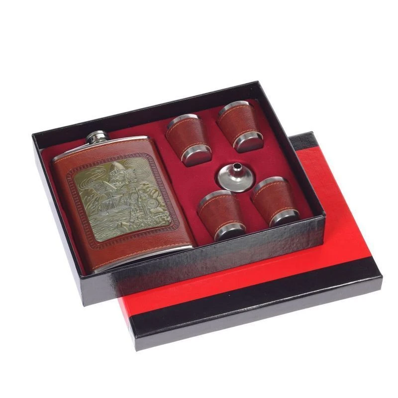 Набор из 6-ти предм.: фляжка 250 мл, 4 стопки 30 мл, воронка, изготовлена из коррозионностойкой стали и полимерных материалов. Размер: L21 W4 H17 см, упаковка-подарочная коробка.