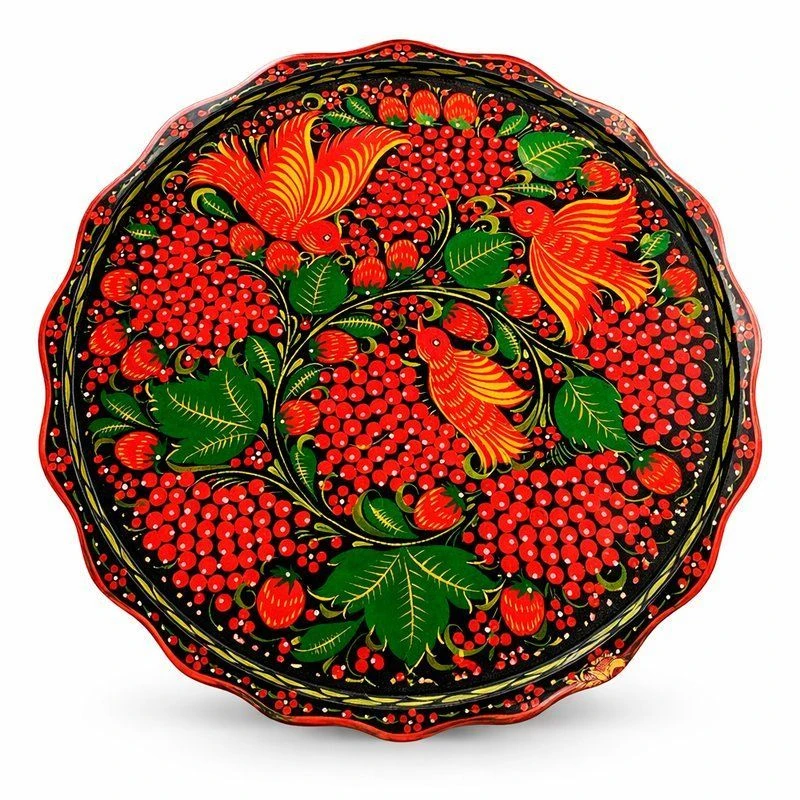 Поднос диматром на 400мм роспись хохлома. По-радужному яркий поднос станет чудесным украшением Вашей кухни, а также обеденного стола. От узора невозможно оторвать глаз - огненно-яркие птички, россыпь алых ягод, вьющаяся зеленая листва.