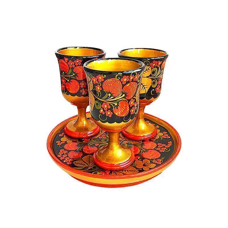 Набор для вина дерево (3 фужера, тарелка 19см) Хохлома (1)