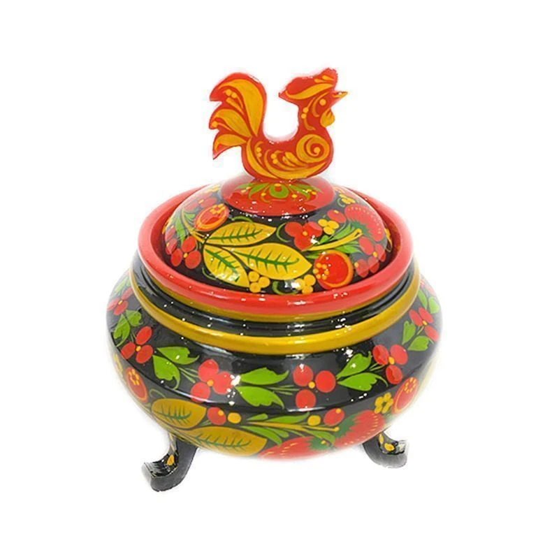 Блестящая яркая сахарница с хохломской росписью на трёх ножках. Крышка украшена задорной фигурой петушка - золотого гребешка.
