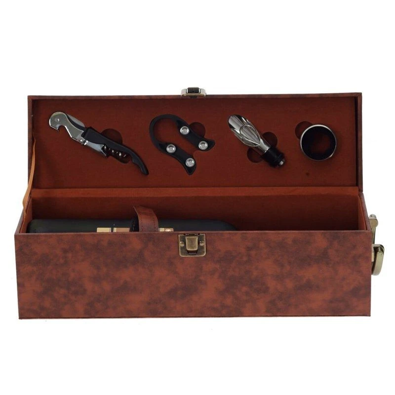 Элегантная шкатулка для одной бутылки, выполненная в коричневом тоне с отделкой под состаренную кожу. Крышка на металлических петлях фиксируется классической защёлкой цвета латуни, сбоку имеется компактная ручка для переноса. Внутри — мягкая подкладка и ремешок, который надёжно удерживает бутылку при транспортировке. В крышке расположены формованные гнёзда с инструментами: сомелье?нож (штопор с ножом для капсулы), резак фольги, пробка аэратор-декантер для аккуратного налива и кольцо?каплеуловитель. Набор позволяет открыть, разлить и закрыть вино без лишних усилий. Стильная шкатулка станет готовым подарком для ценителей и удобным аксессуаром для дома, поездок и праздничных подач.
