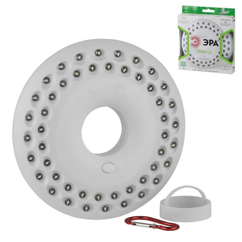 Кемпинговый фонарь ЭРА KB-601 НЛО-48 48xLED, 3xAA Б0029178 идеален для отдыха на природе, дальних поездок на машине, туризма и т. д. Очень популярен среди рыбаков и охотников. Имеет несколько вариантов крепления: на горлышко бутылки (за счет отверстия в центре), к металлическим поверхностям (благодаря встроенным магнитам), а также к палатке или на ветку дерева за счет наличия подвеса с карабином.