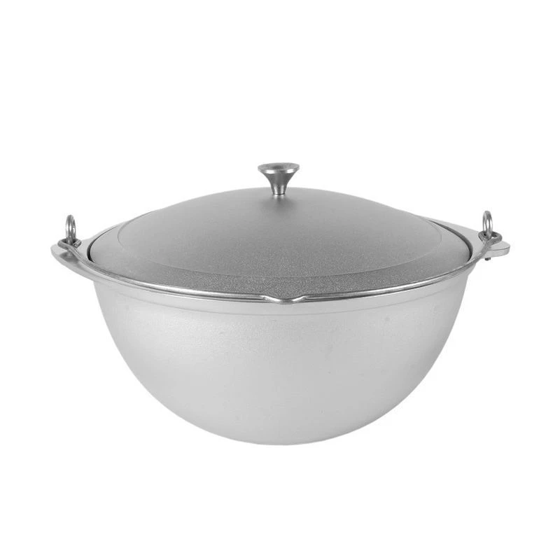Котел изготавливается из пищевых алюминиевых сплавов методом кокильного литья. Это самый качественный и экологически чистый способ изготовления литой толстостенной посуды. В казане с толстыми стенками обеспечивается равномерный нагрев содержимого, благодаря чему пища не пригорает.