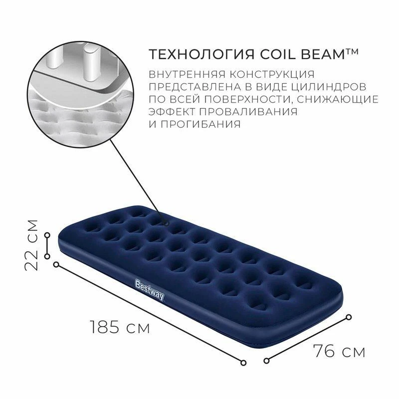 Одноместный надувной матрас серии Flocked Air Bed изготовлен по технологии COIL BEAM CONSTRUCTION. Внутренняя конструкция матраса с усиленными перегородками в виде стаканов, использование трубчатых перегородок придет матрасу повышенную выносливость и жесткость.