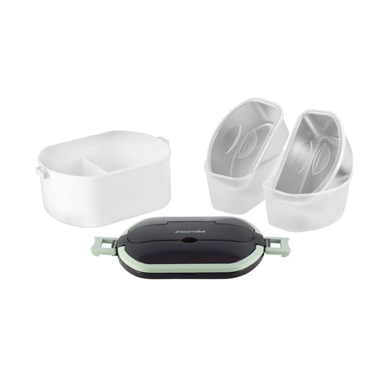 Ланч-бокс обладает высоким качеством, надежностью, компактными размерами и красочным эстетичным дизайном. Прекрасно подходит для транспортировки домашних обедов и будет просто незаменимым для офисных работников или школьников. Продуманная конструкция, имеет отсек для транспортировки столовых приборов, 2 съемные емкости из пищевой нержавеющей стали которые защищены дополнительным чехлом из пластика, а под крышкой, над емкостями, будет помещаться например хлеб или салфетки. Такой контейнер для пищевых продуктов может стать прекрасным подарком для Ваших близких и друзей.не подходит для разогрева в микроволновых печах.