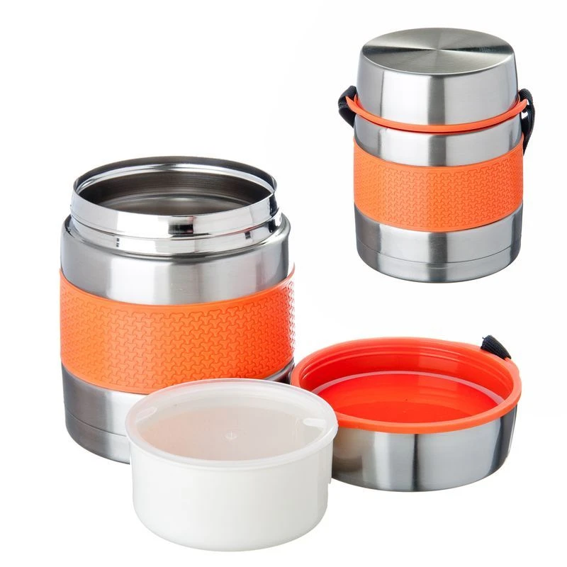 Термос ланч-бокс объемом 1,0л с металлической колбой и в корпусе из нержавеющей стали с силиконовой вставкой оранжевого цвета, с дополнительным пластиковым контейнером, с завинчивающейся крышкой, укомплектован ремешком.