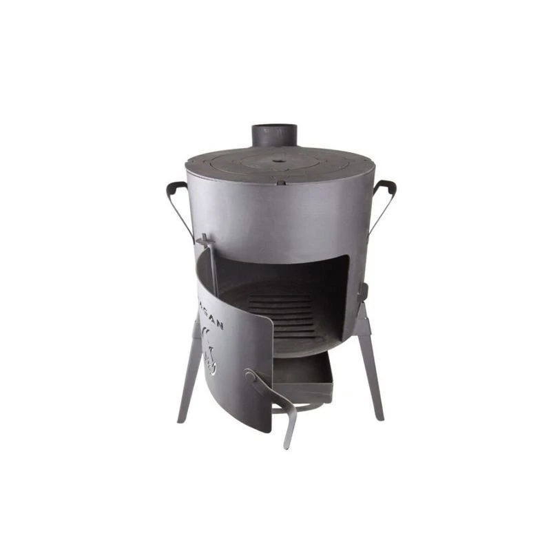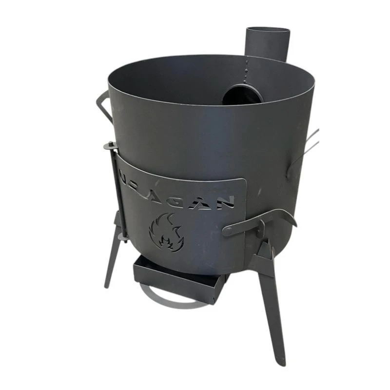Печь для казана с трубой уличная "Ураган" под узбекский казан. Толщина металла - 2мм. Ножки съемные, диаметр посадочного места - 33см, ручки и ножки толщиной 1,5 мм. В комплекте: съемный зольник и дверка с надежным замком. Окрашена термостойкой краской.