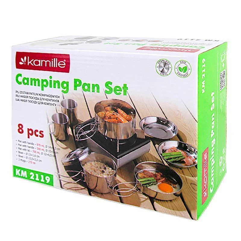 Набор туристической посуды Kamille KM 2119 изготовлен из нержавеющей стали достаточной толщины для готовки, не боится ни огня, ни падений, легко моется, отлично подойдет для любых путешествий. В нем можно готовить на решетке, газовой или бензиновой горелке, на горячих камнях или на углях. Благодаря легкому весу и возможности компактно сложить аксессуары один в один, набор не займет много места в рюкзаке. В комплекте есть мешочек для хранения.