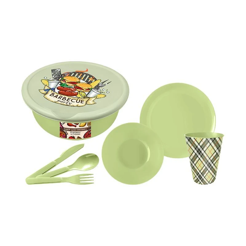 Столовые приборы удобно скрепляются друг с другом с помощью специального фиксатора и не потеряются в процессе транспортировки. Набор для пикника состоит из 25 предметов: миска 3,2л - 1шт., тарелка d 20см - 4шт., миска d 13см - 4шт., стакан с декором - 280мл 4шт., вилка - 4шт., нож - 4шт., ложка - 4шт.