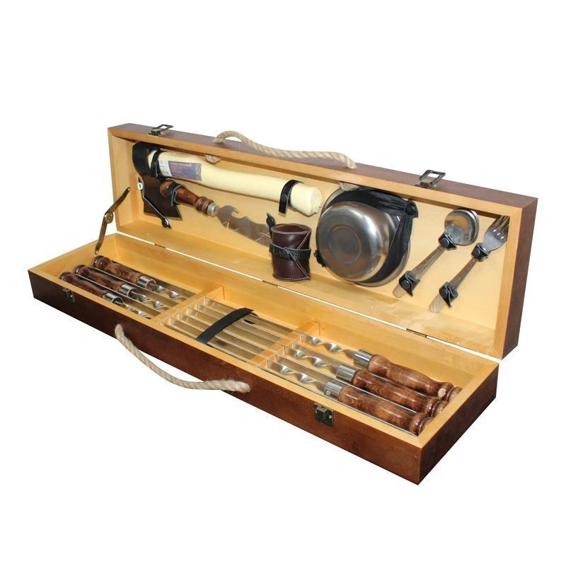 СТАНДАРТНЫЙ набор - 6 шампуров 680х450х12х3мм, топор, нож шампурный, рюмки в чехле 4шт, тарелки 4шт, вилка нерж 4шт, ложка нерж 4шт