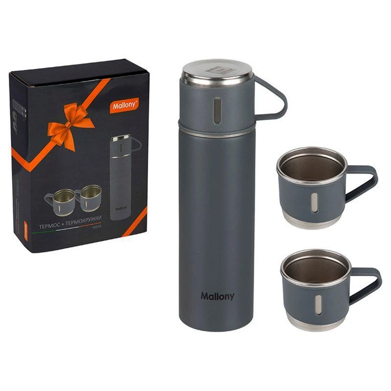 Набор термос + 3 термокружки из нержавеющей стали. Благодаря специальному покрытию его удобно и приятно держать в руке. Упакован в подарочную коробку. Объем термоса: 500 мл Объем кружки: 150 мл