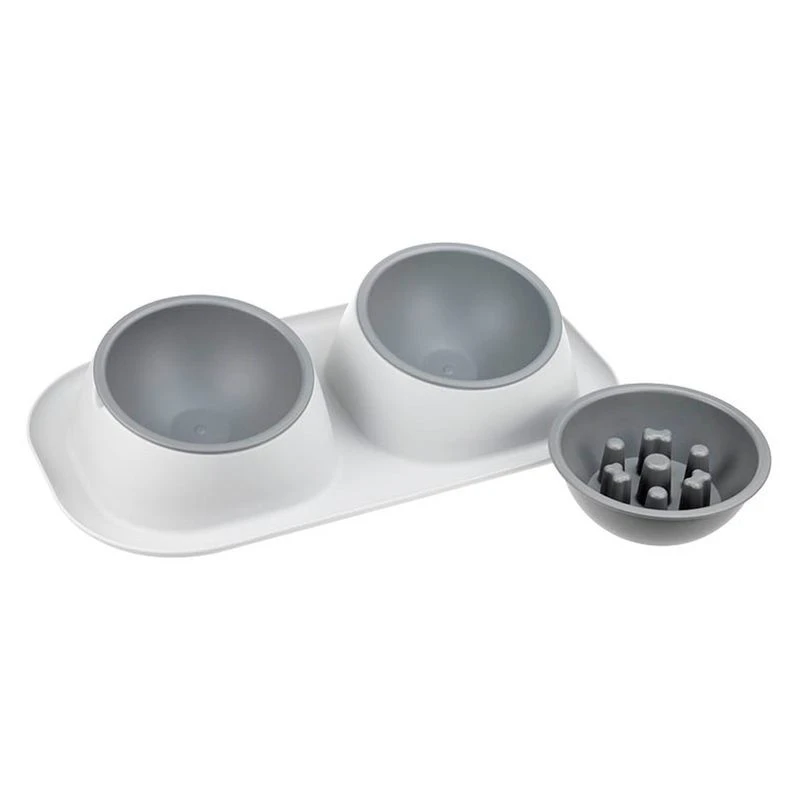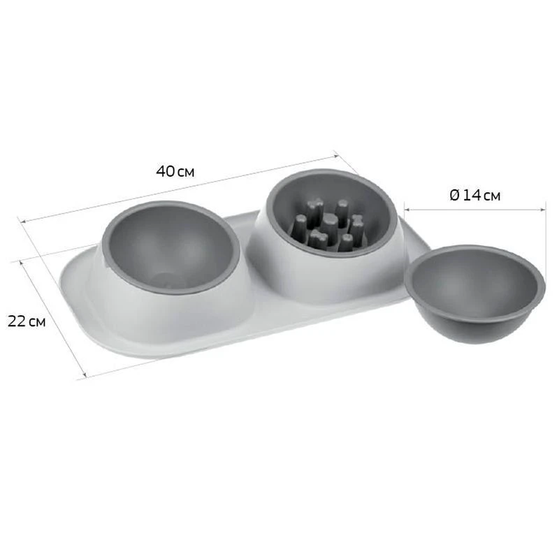 Изделие состоит из корпуса и двух съёмных мисок объёмом 0,45 л. Миска для медленного кормления объёмом 0,3 л идет в подарок!