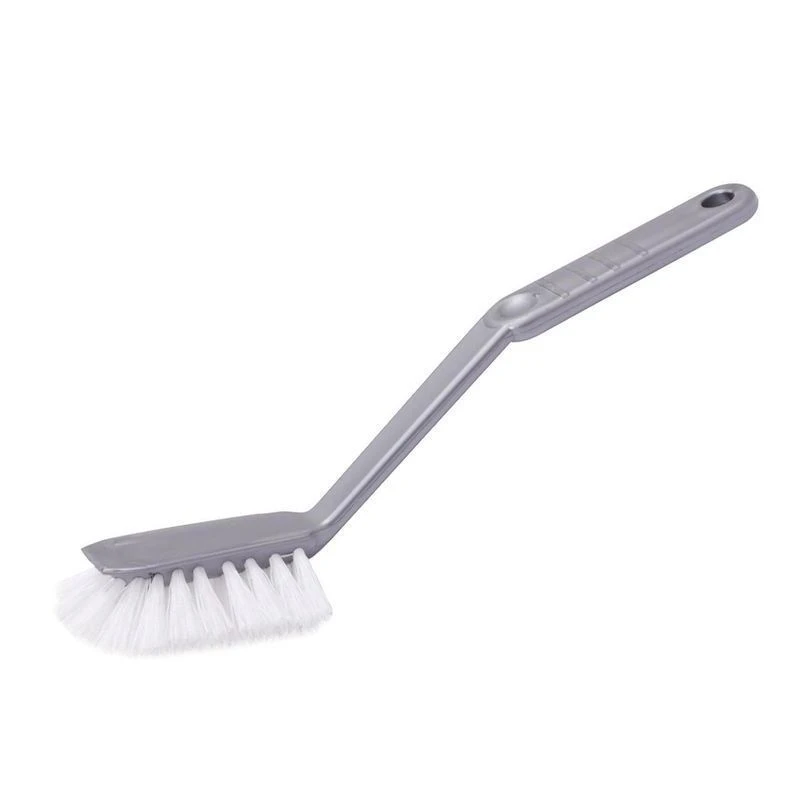 Щетка для мытья посуды, благодаря особому расположению щетины, идеально подходит для мытья сковородок и кастрюль. Удобная эргономическая ручка имеет отверстие для размещения на крючке. Ворс щетки прочный и не деформируется при высоких температурах воды.