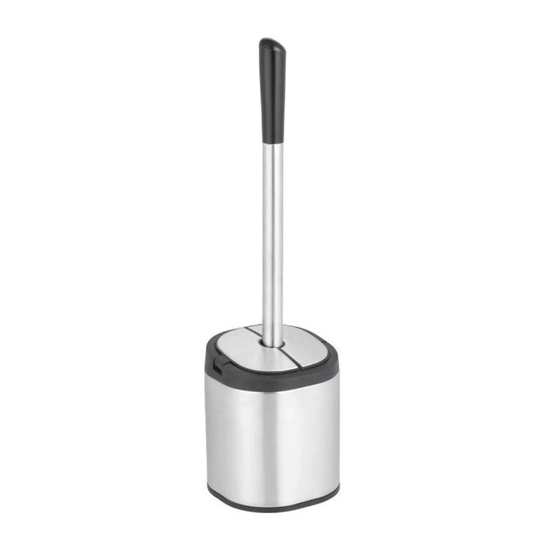Щётка-ёршик гарнитур для туалета с автоматической закрывающей и открывающейся крышкой, компактный и стильный дизайн. Цвет щётки чёрный, удобная ручка. Материал: корпус из н-ж стали 410 и пластика, ручка из н-ж стали 210 и пластика.