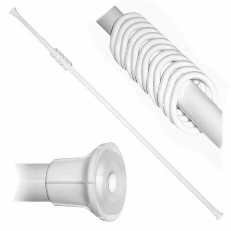 Карниз для шторки в ванную комнату с раздвижным телескопическим механизмом для регулировки длины. Конструкция представляет собой две трубки, вставленные одна в другую. Внутри карниза скрывается специальный механизм с пружиной, отвечающий за фиксацию трубок относительно друг друга в выбранном положении. Силиконовые вставки по краям карниза предотвратят его скольжение по стенам. В комплект поставки входят 12 пластиковых колец для крепления шторки к карнизу.