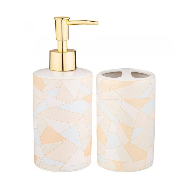Набор для ванной комнаты состоит из двух предметов: диспенсера для жидкого мыла и стакана для зубной пасты и зубных щеток.