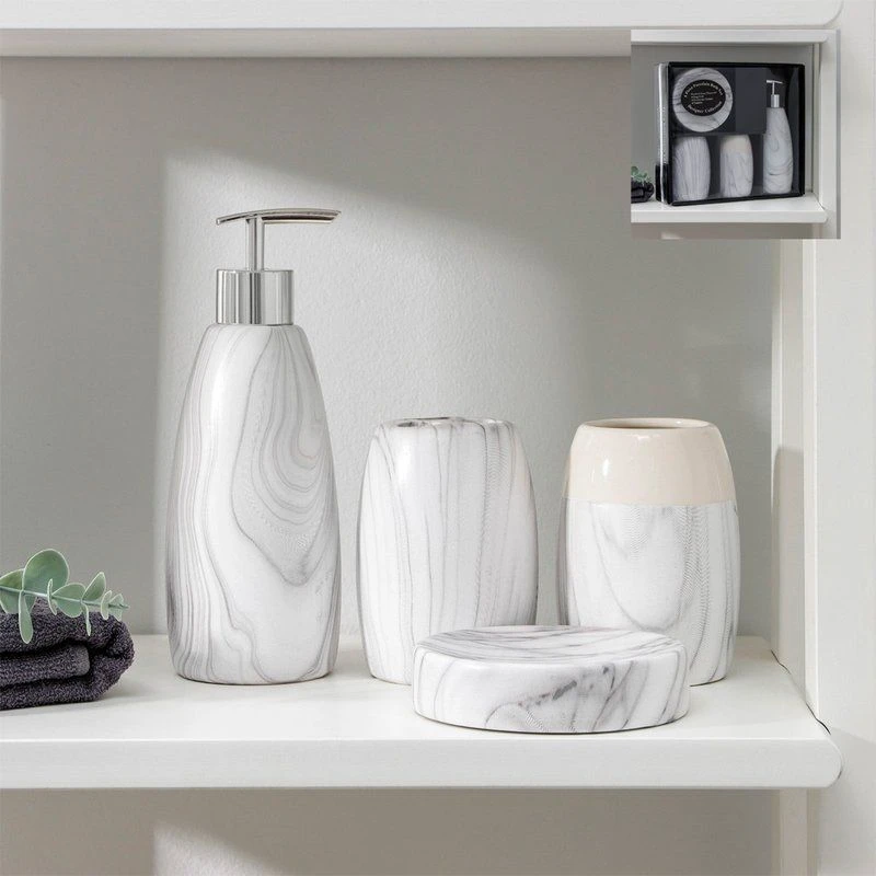 Набор аксессуаров организует пространство и станет стильным украшением Вашей ванной комнаты. За счет сдержанного дизайна данный керамический набор в ванную подойдет к любому дизайну ванной комнаты. Набор состоит из 4 предметов: 2 стакана, мыльница, дозатор.