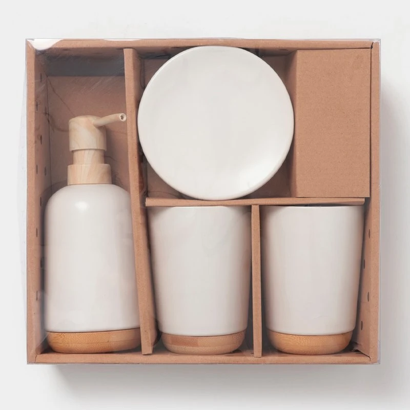 Набор аксессуаров организует пространство и станет стильным украшением Вашей ванной комнаты. За счет сдержанного дизайна данный керамический набор в ванную подойдет к любому дизайну ванной комнаты. Набор состоит из 4 предметов: 2 стакана, мыльница, дозатор.