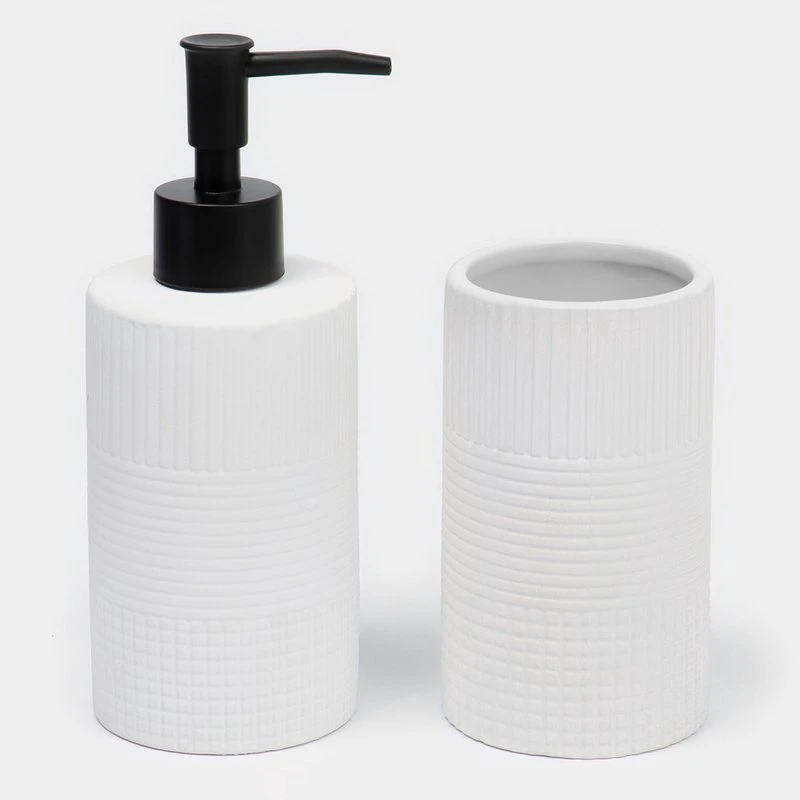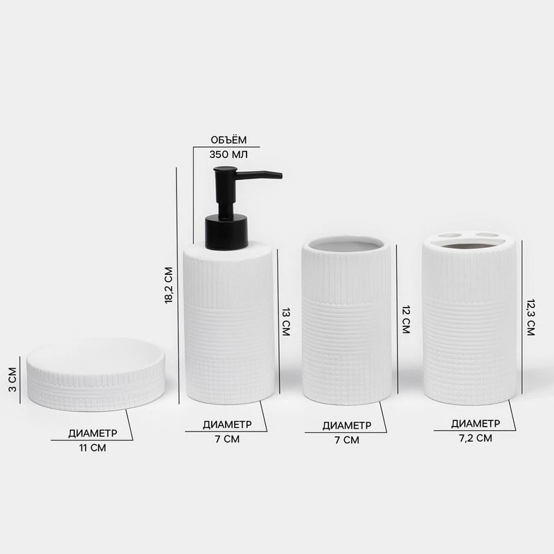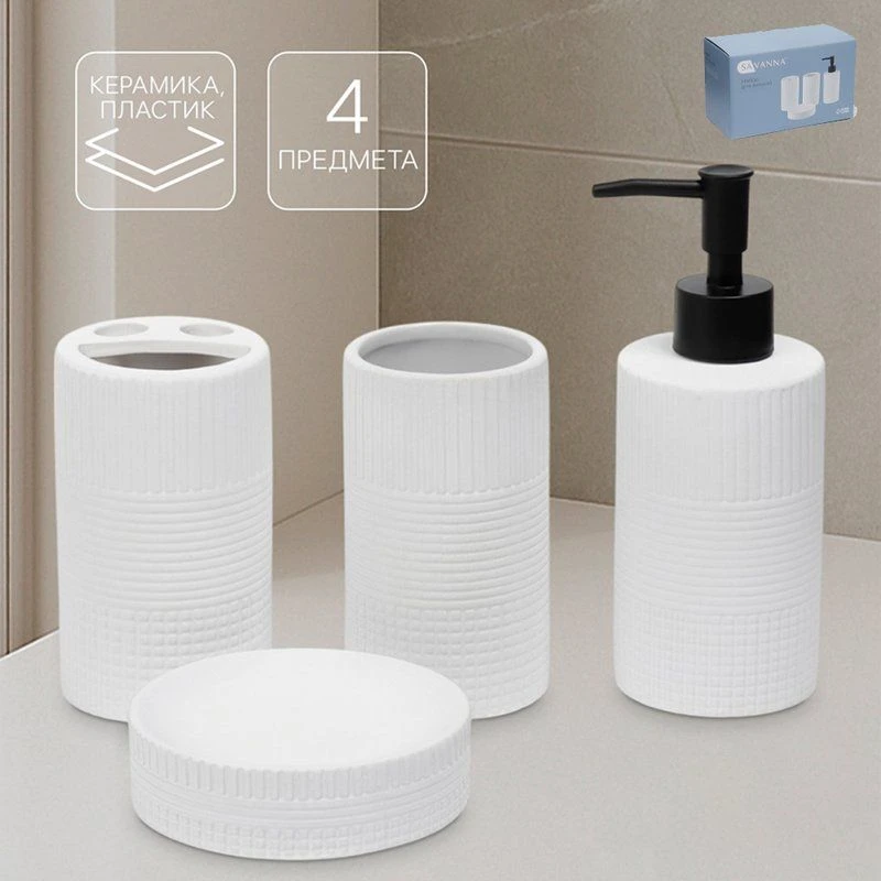 Элегантный набор для ванной из 4-х предметов выполнен в белом цвете. Изготовленный из высококачественной керамики, этот набор станет стильным дополнением вашей ванной комнаты. Однотонный дизайн без рисунка придаёт ему особый шарм и подчеркивает минималистичный стиль.