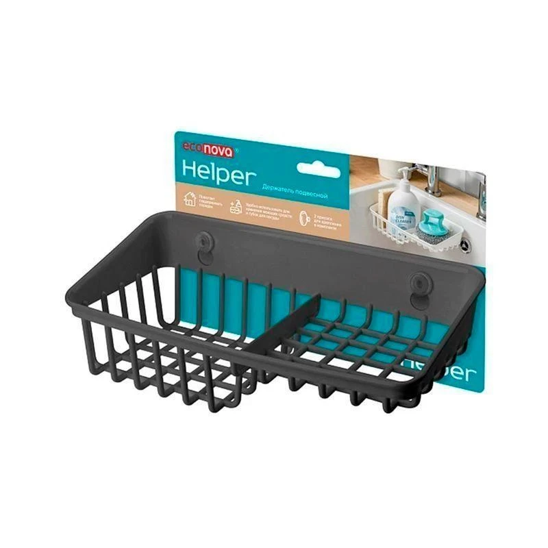 Подвесные держатели линейки HELPER торговой марки Econova позаботятся о чистоте ваших кухонных аксессуаров для мытья посуды. Широкий сетчатый держатель-полочка для губки, щётки, тряпки или моющего средства крепится к поверхности раковины или глянцевому фартуку с помощью присосов или саморезов. Держатель позволяет освободить плоскость возле раковины на кухне от моющего средства, губок и прочего и сэкономить место. Хранение губки и тряпки в держателе позволяет лишней жидкости стекать прямо в раковину и уберегает поверхность столешницы от избыточной влажности, а сетчатый корпус держателя обеспечивает быстрое просыхание губки или тряпки и предотвращает развитие на них грибка. Держатель продаётся в стильной упаковке, в комплекте идут два присоса. Легко моется, в том числе в посудомоечной машине (без присосов). Изготовлен из полипропилена, не содержит бисфенол А.