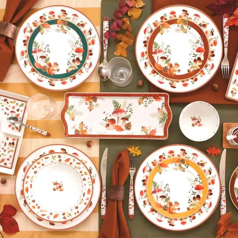 Описание: коллекция фарфоровой посуды с изображениями различных даров осени: грибов, ягод, листьев и белки с жёлудем.