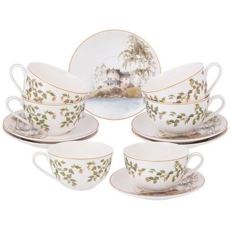 Дизайн чашек и блюдец выполнен в стиле "Берёзки". Это сочетание белого и зеленого цветов, которое создает атмосферу уюта и гармонии. На чашках и блюдцах изображены цветы и растения, что придает им еще больше изящества.
