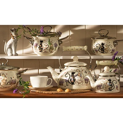 Эмалированная посуда AGNESS - отличный выбор для Вашей кухни! Посуда из эксклюзивной серии «Lavander cats» от торговой марки AGNESS станет приятным акцентом на любой кухне. Благодаря неповторимому дизайну каждое изделие будет настоящим украшением вашей кухни. Данная посуда прекрасно подойдет в качестве подарка и никого не оставит равнодушным. Сделайте себе подарок, побалуйте себя и своих близких! Эмалированная посуда обладает рядом преимуществ: • Эмалированная посуда не требует особого ухода и легко моется • Эмалированная посуда гигиенична - не удерживает болезнетворных микробов и бактерий • Эргономичная керамическая ручка с фиксатором. Используйте стопер для ручки, когда нагреваете чайник для плиты. • Эмалированная посуда подходит для всех видов плит, включая ИНДУКЦИОННЫЕ ПЛИТЫ. • Посуда проходит 3 этапа обжига, эта технология позволяет сохранить яркость расцветок деколи, а также придает прочность эмалированной посуде • Все деколи наносятся вручную, а затем обжигаются при температуре около 800 С • Толщина стенок и дна посуды 0,8мм Правила ухода за эмалированной посудой просты: • Не использовать абразивные чистящие средства; • Мыть с применением нейтральных моющих средств, подходит для мытья в посудомоечной машине; • Избегать резкого перепада температур. • Не нагревать пустой чайник, а также не допускать выкипания воды • При использовании на плите отпускать ручку чайника на стопер • При транспортировке, хранении и использовании необходимо оберегать эмалированную посуду от механических повреждений